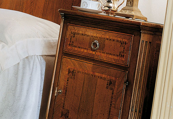 La collezione Luigi XIV propone dei pezzi di elevato pregio per la qualità dei materiali accuratamente selezionati e per la maestria con cui viene eseguita la lavorazione di ogni singola parte che compone il mobile. I cassetti, assemblati con incastri a coda di rondine, hanno serrature a chiave e gli interni sono rivestiti in carta Varese. I mobili sono realizzati con lastre dello spessore di 2 mm in noce piallato a mano con eleganti filettature ad intarsio in bois de rose, zebrano, palissandro e acero. I battenti perimetrali dei cassetti e delle antine prevedono l'inserimento di massellino in noce da 8 mm con una particolare lavorazione a "spina di pesce". Gli schienali in abete hanno spessore di 1,5 cm. Il letto presenta la testata con decorazione intagliata a mano e dorata con foglia d'oro zecchino 24 carati. La finitura viene eseguita a mano con 13 diversi passaggi, utilizzando tinte naturali all'acqua, gommalacca e cera vergine d'api.